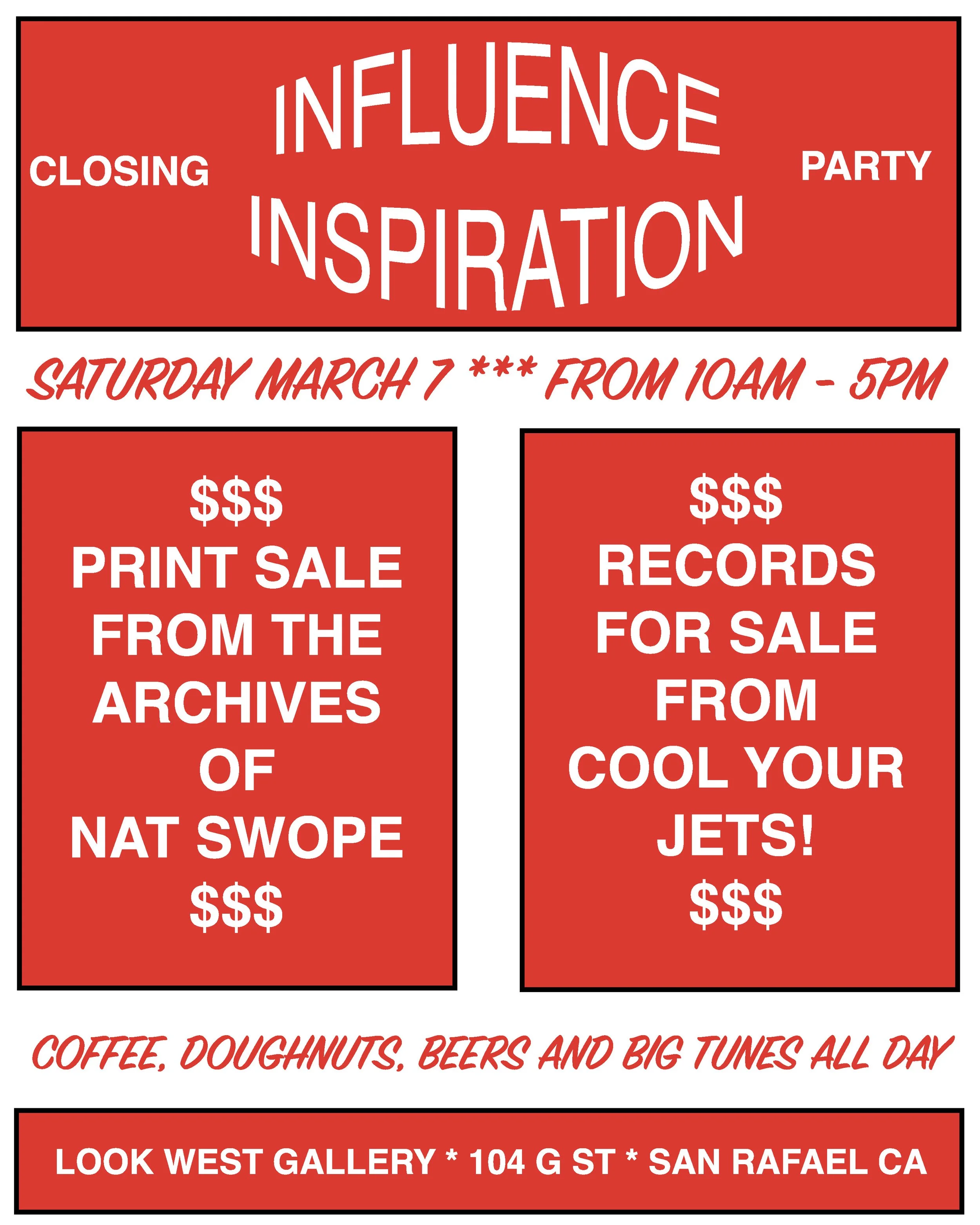 PLEASE JOIN US ON SATURDAY MARCH 7TH IN CELEBRATING ONE FINAL DAY OF INFLUENCE / INSPIRATION, SELECT SILKSCREEN PRINTS AND OTHER THINGS FROM THE ARCHIVES OF NAT SWOPE AT LOOK WEST GALLERY. WE HAVE A DEFINITELY FUN DAY SORTA MOSTLY PLANNED WHICH CERTAINLY WILL INCLUDE: PRINTS COFFEE DOUGHNUTS BEER RECORDS TSHIRTS BOOKS ASSORTEDWATER BIGTUNES BIGSMILES TOGETHERNESS. ALSO MAYBE INCLUDED: OTHER THINGS. NAT WILL OPEN UP HIS ARCHIVE OF PRINTS ONE LAST TIME “BEFORE IT ALL RETURNS TO DEEP STORAGE, NEVER TO BE SEEN AGAIN…” SO YEAH, COME CHECK IT.